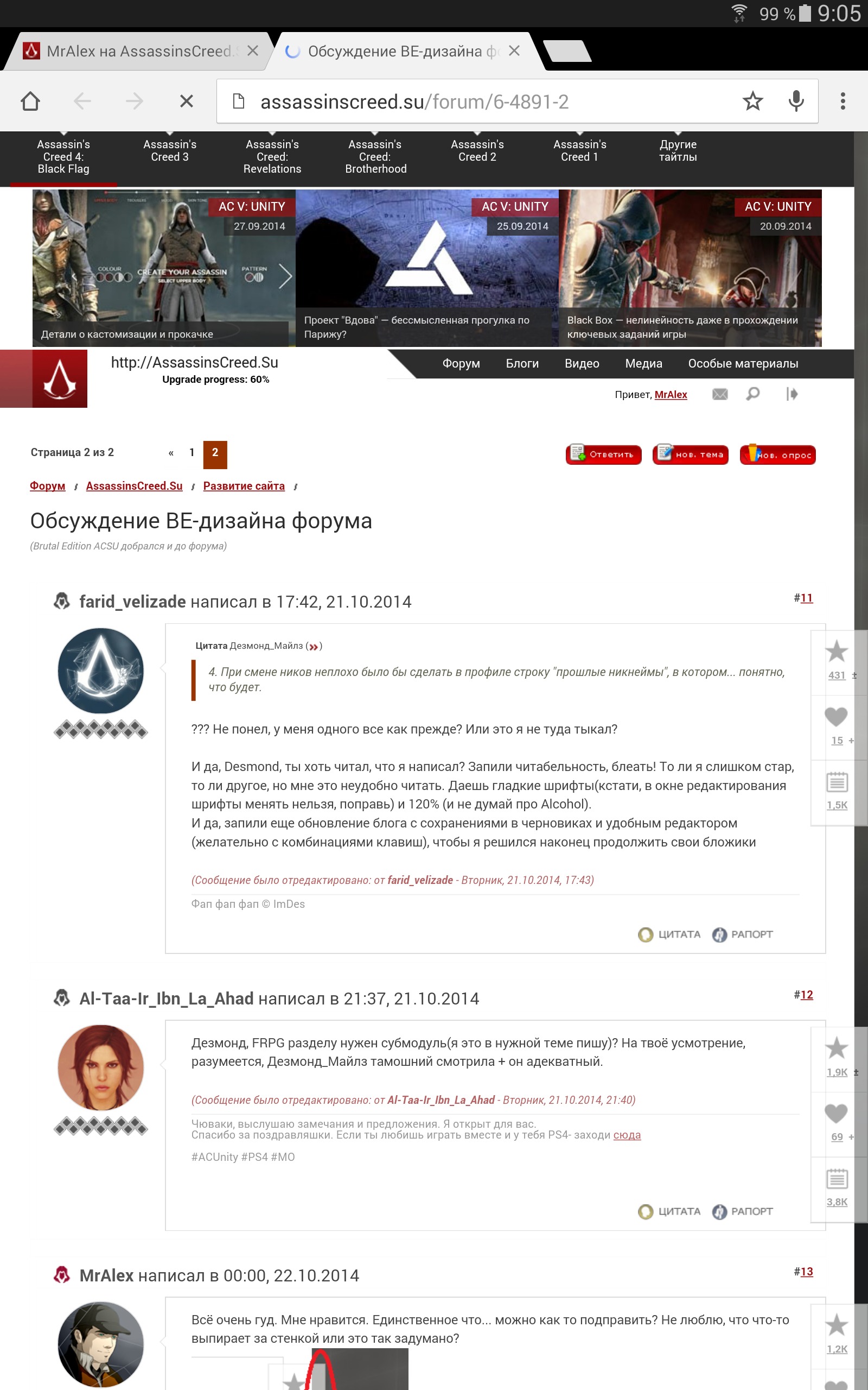 1, Теперь непонятно как обращаться к собеседнику. Я про этот программный форумный код имею в виду Код [b]Какое-то имя[/b], Если кто знает, расскажите как. 2, На планшете обновление полной версии сайта отображается, почему-то я не знаю, может это и с планшетом как-то связано или с моим браузером на планшете, но и тем не менее, слегка кривовато. Отображаются старые добрые значки ассассинов, показывающие новые посты в определённых темах. Полную картину, сейчас не могу показать, ибо планшетик от энергетического голодания сдох ;D Завтра, ну точнее уже сегодня, при первой же возможности постараюсь показать, как отображается. Добавлено (23.10.2014, 14:13) --------------------------------------------- Ну вот, как-то так. Однако на заводском браузере проверил, такой маленькой проблемы не выявил. Такая проблема только в браузере планшетном google chrome. Будет интересно почитать, почему так. (Сообщение было отредактировано: от MrAlex - Четверг, 23.10.2014, 14:18)
